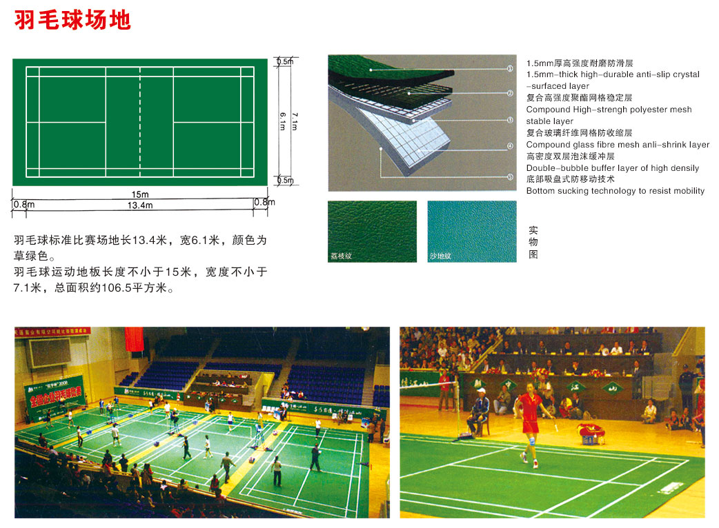 2、在国际比赛中,PVC运动地板是羽毛球、乒乓球、排球、手球指定使用的地板材料。