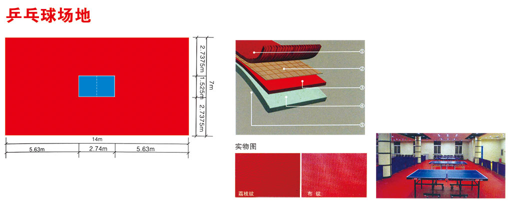 标准乒乓球台长2.74米,宽1.525米,高0.76米,场地颜色为枣红色乒乓球运动地板总面积长不小于14米,宽7米以上,总面积约98平方米。